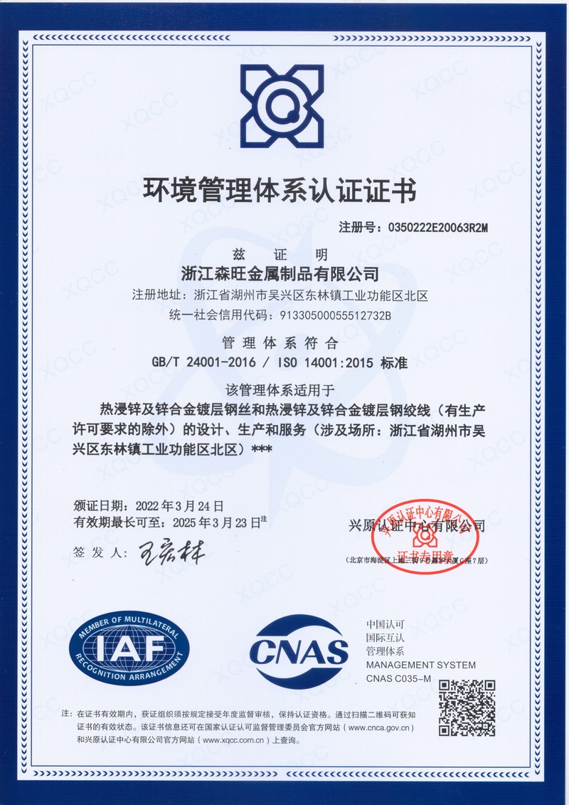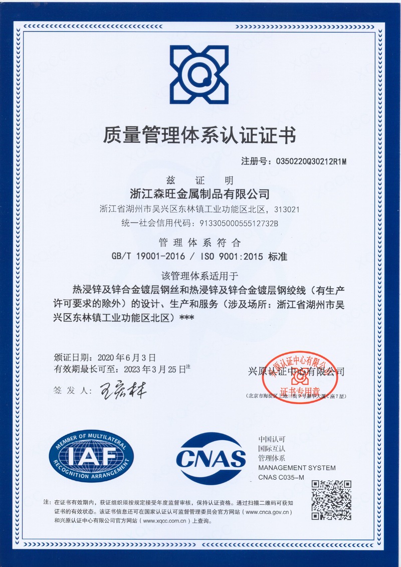 浙江森旺金屬制品有限公司成立于2012年,坐落湖州市吳興區(qū)東林鎮(zhèn)工業(yè)功能區(qū)。公司專業(yè)從事各類鍍鋅鋼絲、鋼絞線等產(chǎn)品的開發(fā)及生產(chǎn)。目前產(chǎn)品已廣泛應(yīng)用于各類通信光電纜,電力輸送,電氣化鐵路工程,各類堤壩防護(hù)及農(nóng)業(yè)溫室等工程領(lǐng)域。公司秉承“追求卓越品質(zhì),創(chuàng)建卓著信譽”的經(jīng)營理念,始終堅持專業(yè)化、規(guī)模化的經(jīng)營模式。